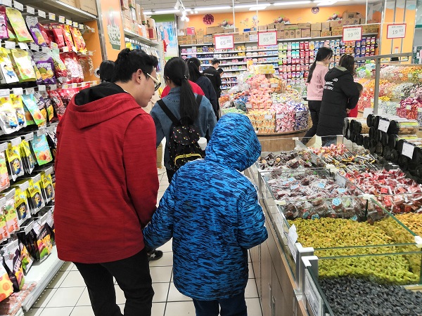 在超市内,孩子们排成一队,由志愿者和老师们带领,在货架旁穿行,让孩子们见一见各种各样的商品,趁机认一下各种蔬菜水果。尽管很想要货架上的饼干或糖果,孩子们在志愿者的耐心劝说下还是数次克制住伸手拿喜欢物品的冲动。有一个男孩一见到玩具货架就不走了,据老师说他很喜欢托马斯小火车,不管他正在做什么,每次看见小火车就会放下眼前的事冲过去。顺利出了超市,老师分发刚刚买的糖果,孩子们坐在一起高兴地吃着,在场的老师和志愿者都能感受出他们发自内心的快乐,这正是志愿活动给志愿者们带来的最大收获。