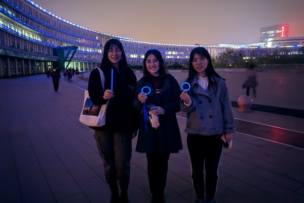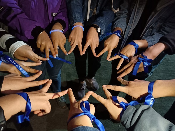 4月2日中午,爱心社的干事们于各校区设置展台,在校内宣传自闭症日。唐小爱向同学们发放设置有自闭症相关问题的调查问卷,结合前期在微信等媒体平台回收的问卷情况,了解公众对于自闭症的认识,方便今后对自闭症知识的普及。此外,爱心社邀请同学们参加“星光夜跑”,为参与者发放荧光棒与蓝色丝带,鼓励更多人加入到自闭症宣传的队伍。展台前人头攒动,同学们积极参与其中,为自闭症儿童贡献一份爱心。当天夜晚,同学们纷纷聚集到操场上跑步,或是锻炼,或是受邀而来,或成单,或成行,腕系蓝丝带,手握荧光棒,在黑夜中奔跑。那黑暗中跳动的蓝色荧光,如夜空中闪烁的星光。正是这点点滴滴的亮光,让今晚的夜跑有了特殊的意义,也让社会看到这个群体的存在。