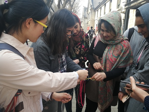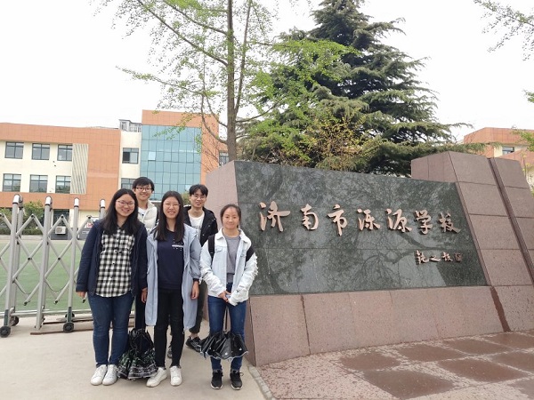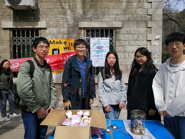 前期摆展台期间,同学们积极地领编绳和布袋,更有热心的外国友人现场进行手绳编织,既增添了展台的趣味性,也使活动参与范围进一步扩大。此后的两次展台也吸引了不少同学前来询问,也有同学直接将自己的闲置物品捐到展台处。经过近一周的手工品制作及爱心捐赠,所集物品既有精美的布袋也有杂志书刊、玩偶等,此后物品或在群内竞价拍卖,或在展台直接卖出,最终共得善款二百余元。4月8日下午,小组成员携带所募钱款购买的教学用具前往济南市泺源学校,与学校老师交流了解具体情况后,带着活动全体参与人员的满满心意陪伴那里的儿童度过了一个美好的下午。