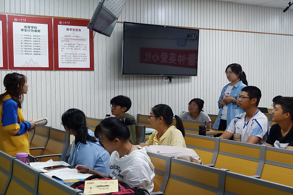 在趵突泉校区,17级活动实践部的部长田阳和趵突泉校区副社付铭玉等人也来到了宣讲会现场。在18级工作组介绍社团,为新生们答疑之后,她们又以第十届唐仲英德育奖学金交流会为例,分享了自己的心得体会尤其是归属感的来源,并与新生们继续讨论交流,让他们对社团的了解更进一步。